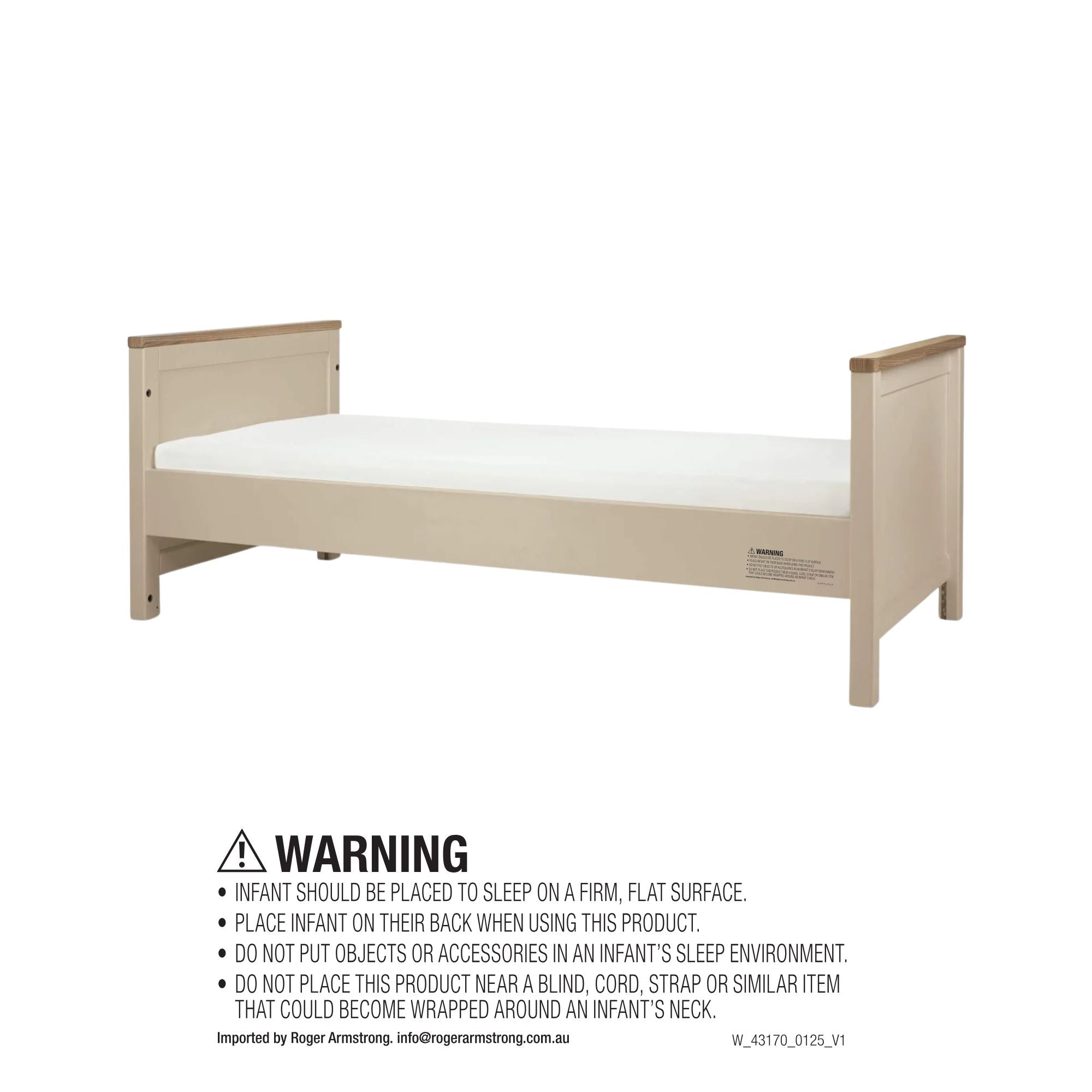 With a distinct two-tone wood-effect and white style, that looks great in any nursery bedroom. Designed to see you from birth until around 4 years old, the Harwell Cotbed converts easily from cot to a toddler bed. With 2 easily adjustable cot base heights, you can pop baby down for a nap without disturbing them, and as they get older and become more mobile, simply lower the height to keep them safely inside their cot. Fixed wooden side panels ensure your little one is kept secure. Simply remove the sides when your little one is ready to convert into a toddler bed. And because our cotbeds have been tested to the strictest Australian safety standards, you can sleep easier knowing your little one is safe.