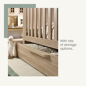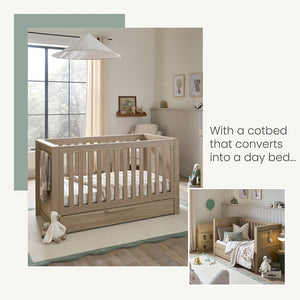 Baby will sleep soundly in this stylish convertible cotbed. With 2 adjustable heights it can also be converted into a day bed or toddler bed, meaning it will grow with your little one for up to 4 years. With plenty of storage underneath as well as a handy hanging rail it’s easy to keep your baby’s nursery organised.