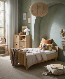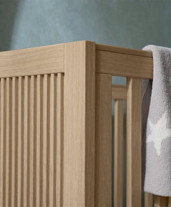 Inspired by Scandinavian and Japanese design, the Oska Cotbed brings modern style and practicality to your nursery. Perfect for growing babies, this versatile cotbed features adjustable base heights for easy lifting and transitions from cotbed to toddler bed, making it suitable from birth up to 4 years. Its warm oak tones, slatted detailing, and natural textures create a calming, contemporary look that complements any nursery décor.