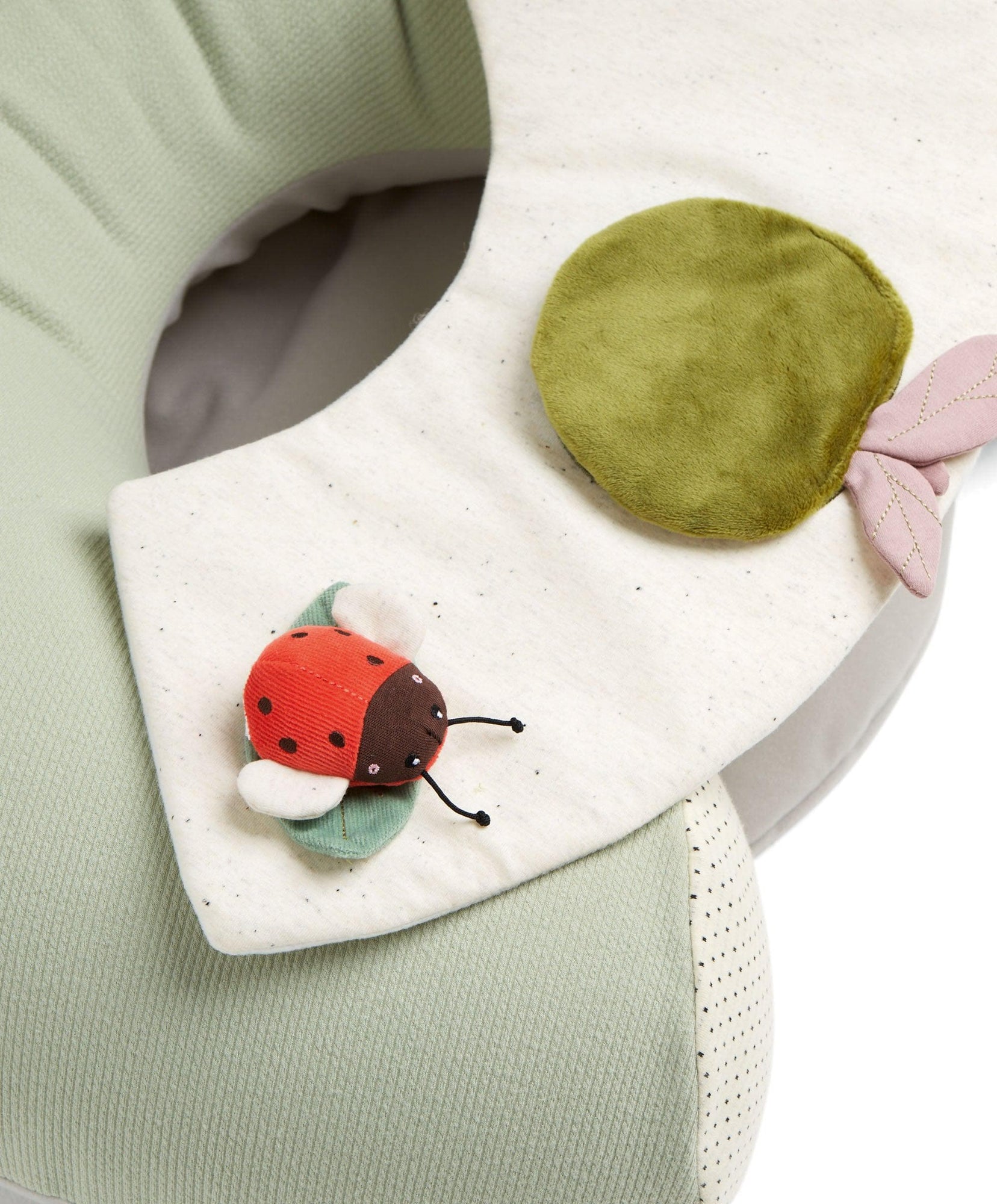 Detachable activity panel with crinkles, rattles, squeaks, tactile fabrics, mirror, teether, and a cuddly ladybird character