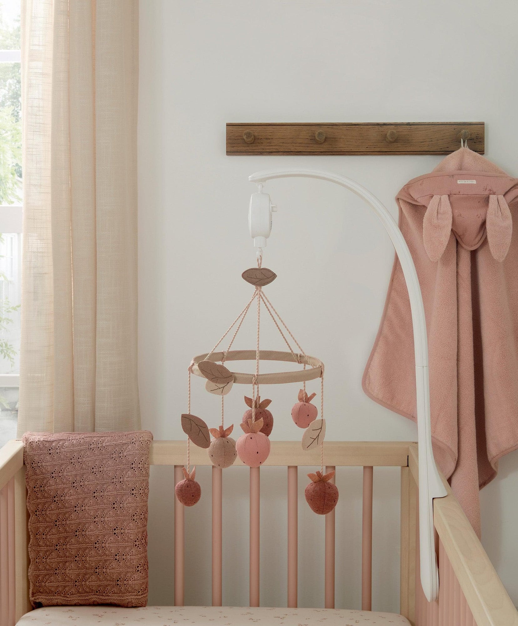 Musical mobile with delicate hanging strawberries. Lullabies for a calming nursery environment.